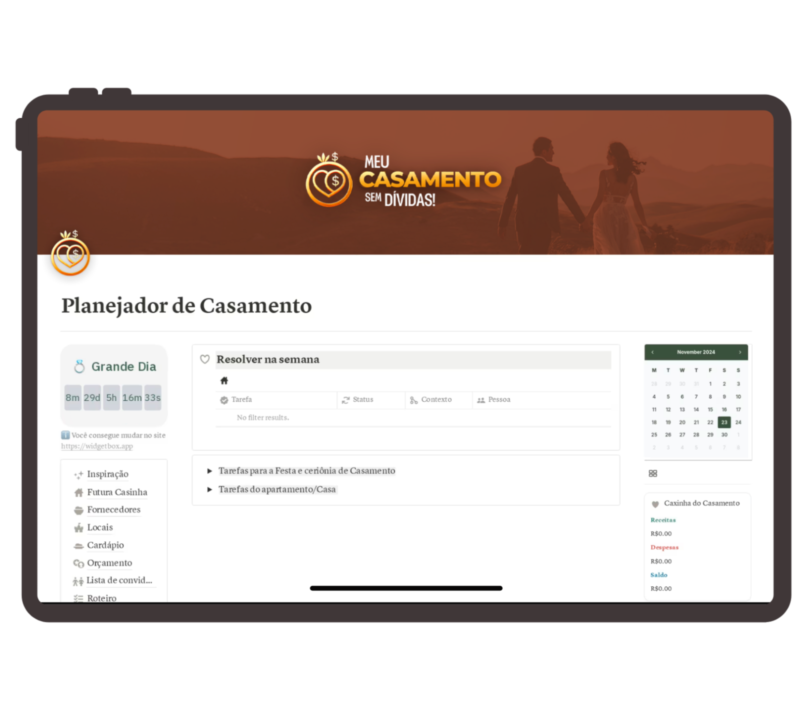 Você terá acesso ao Planejador financeiro, que irá te ajudar a ter um casamento incrível, sem surtar com os boletos e sem precisar vender um rim.